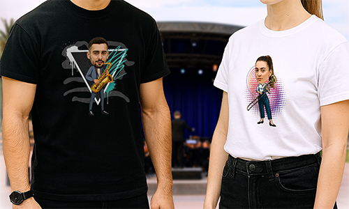 Personalisierte T-Shirts mit einzigartigen Designs, lebendigen Farben und stilisierten Charakteren für verschiedene Hobbys und Berufe
